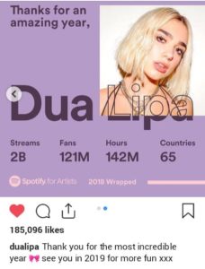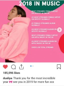 Këngëtarja shqiptare me famë botërore, Dua Lipa ka arritur majat e suksesit në botë derisa pёrmes njё postimi nё instagram ka falenderuar tё gjithё pёrkrahёsit e saj për një vit të mrekullueshëm, transmeton Kabllogrami