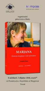 Sot mё 5 dhjetor, nё Presidencёn e Republikёs sё Shqipёrisё nё Tiranё, nёn patronazhin e Presidentit tё Republikёs Ilir Meta, ёshtё bёrё pёrurimi i librit “Marjana – Historia shqiptare e nje austriakeje”, me autore Lindita Sina, i edituar nga Shtёpia Botuese “Kompas”, njofton Kabllogrami