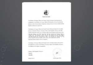 Notën diplomatike, të cilën e ka siguruar ekskluzivisht KTV-ja, më 28 nëntor e ka pranuar Ambasada e Kosovës në Canberra të Australisë.