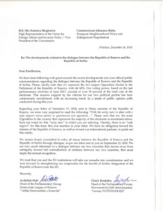 Në letrën e dërguar shkruan se dy partitë e mëdha opozitare nuk e kanë votuar ekipin negociator për të dialoguar me Serbinë, duke shtuar se ky ekip nuk e gëzon mbështetjen e gjerë të elektoratit.