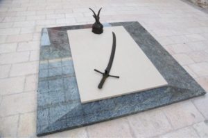 Në mure janë të varura 25 mburoja prej bronzi, të cilat tregojnë 25 betejat kryesore të Skënderbeut. Mbi pllakën e mermerit janë vendosur kopje të shpatës dhe përkrenares prej bronzi të Skënderbeut. atsh /©Kabllogrami/