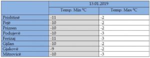 Temperaturat minimale parashihen të lëvizin ndërmjet -11 deri -9 gradë Celsius, ndërsa maksimalet e ditës parashihen të lëvizin ndërmjet -3 deri -2 gradë Celsius.